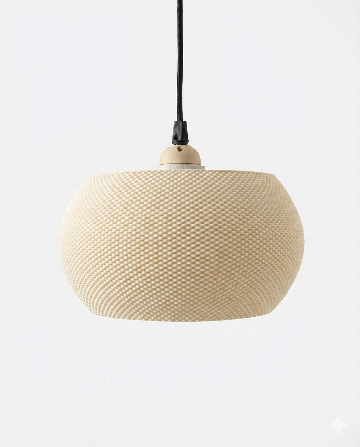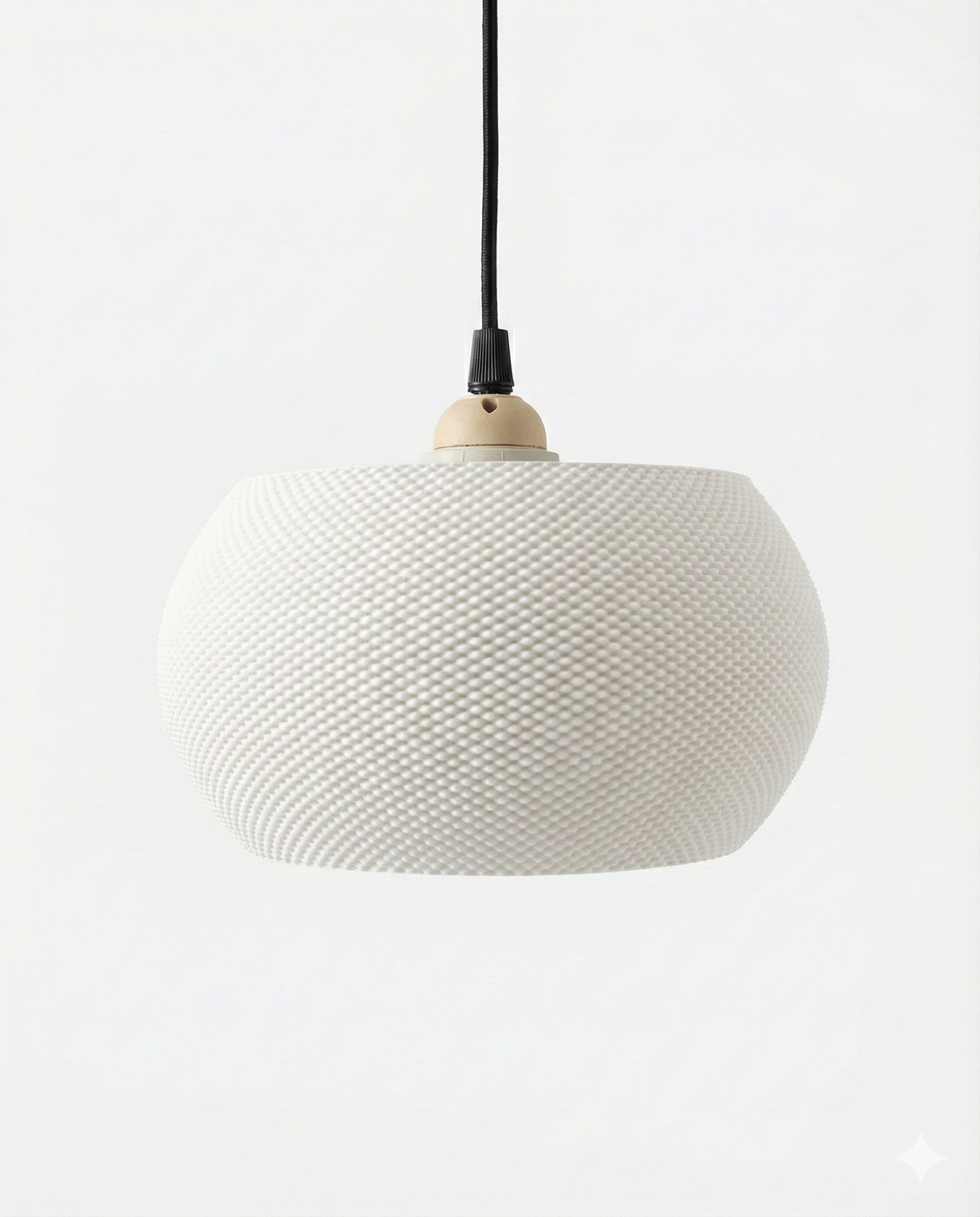 Fabricación aditiva en PETG, cada pieza presenta una textura sutil que filtra la luz creando un efecto decorativo elegante y actual. Incluye portalamparas E27 con cable, lista para instalar.