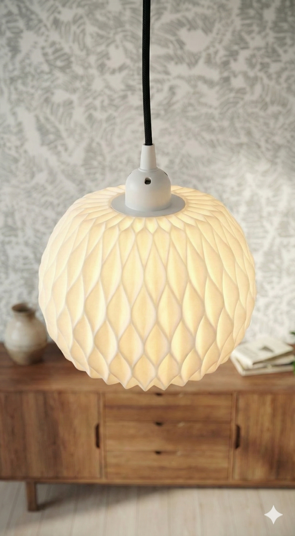 Fabricada mediante fabricación aditiva en PETG reciclable, cada lámpara se produce bajo demanda, reduciendo residuos y apostando por un modelo de decoración más sostenible. Su acabado mate translúcido difumina la luz de forma homogénea, ideal para dormitorios, salones o zonas de comedor.